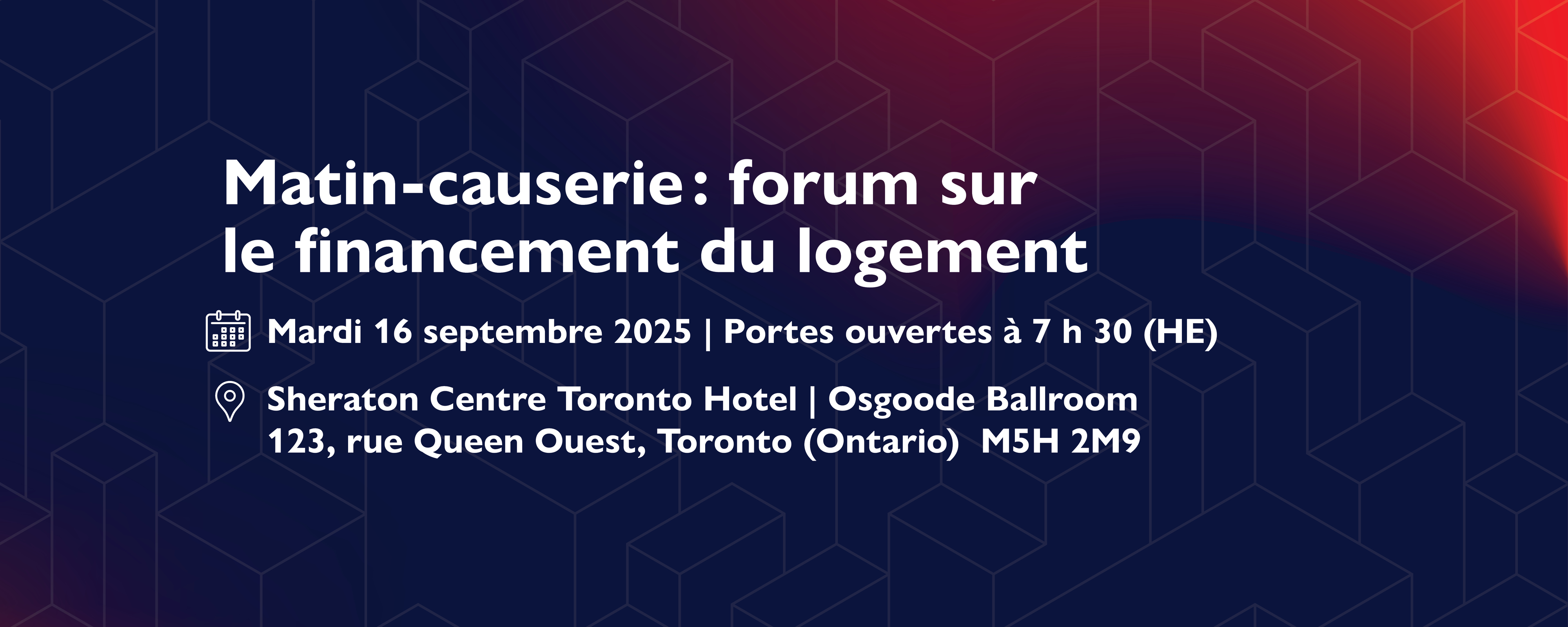 Cet évènement est conçu pour vous offrir des rencontres et des renseignements en matinée. Il réunira des professionnels des secteurs de l’habitation et des finances. Vous pourrez profiter de précieuses occasions de réseautage au cours du déjeuner, de présentations dirigées par des spécialistes et de discussions sur le marché canadien de l’habitation et les activités d’assurance de la SCHL. Vous y obtiendrez aussi des mises à jour opportunes sur les tendances nationales et régionales en matière de logement, les plus récentes prévisions économiques et d’importantes perspectives et faits nouveaux concernant les affaires.